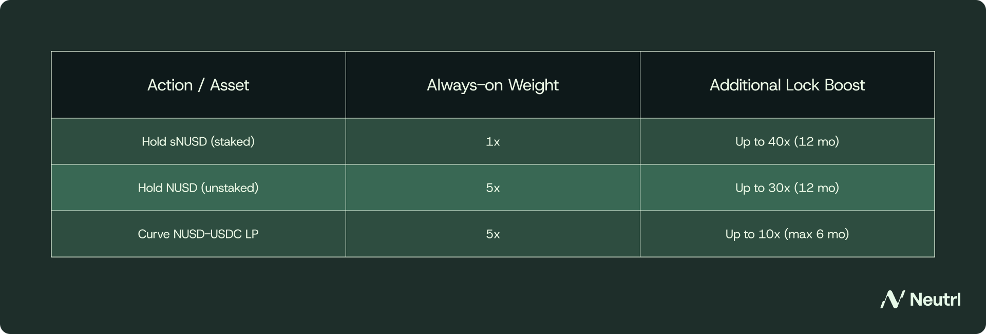 As you can see below, most rewards will go towards fully aligned users who choose to not only hold NUSD but also stake and lock it.