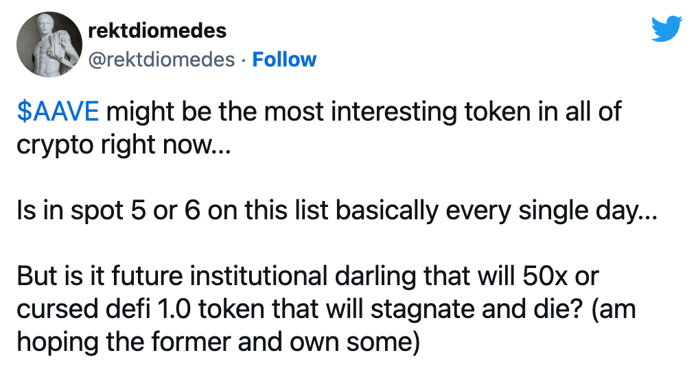Whilst COMP, MKR, XEC and LTC have all made portfolios look pretty plump this week… AAVE has been of particular interest with its continued cross-chain deployments and most notably with the long-awaited launch of GHO stablecoin (we hope) being right around the corner.