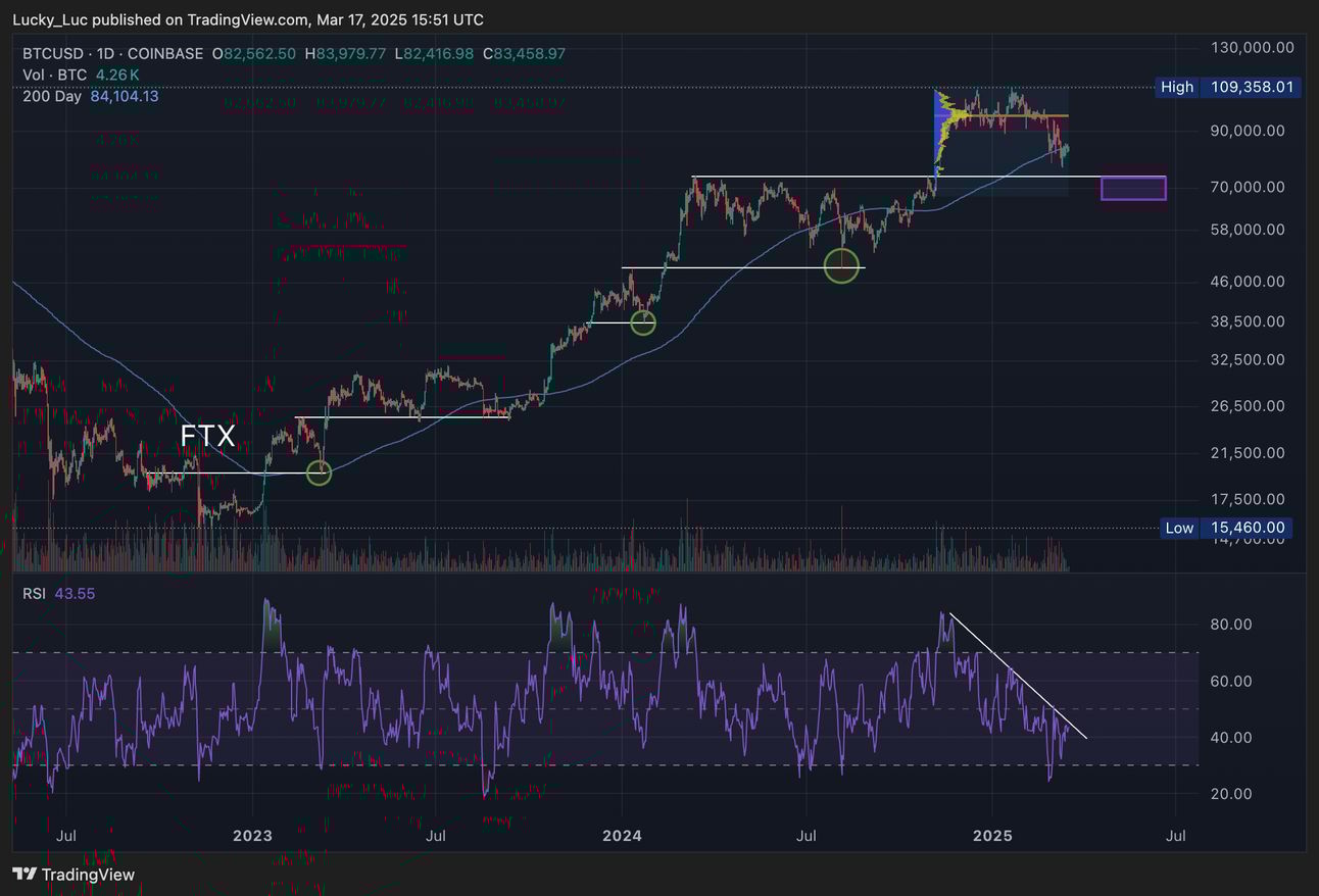 Price is once again consolidating under the 200-day moving average (blue line), as it did for three months last year and two months or so in 2023. Everybody seems to be expecting that $73k breakout retest now, so I suspect we either front-run to the upsideβmaybe sweep the previous low at $76kβor go lowerβmid to high 60sβto flush early longs. This all likely happens in April, though. My base case is up into month end.