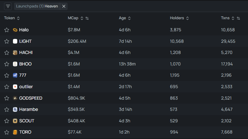The Heave mania continues. Here are the most trending tokens on Heaven for the past 24h: