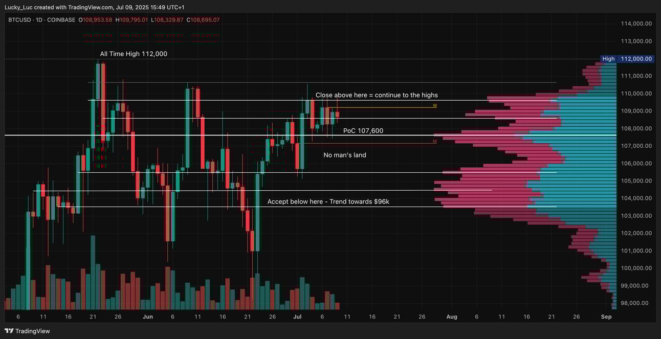 Bitcoin is a tale of two ranges here. We are holding strong in the upper range after failing to break down yesterday, which is bullish. Below 107,600, we take the elevator lower, through ‘No Man’s Land’ to range no.2, which runs from 105,500 to 103,500.