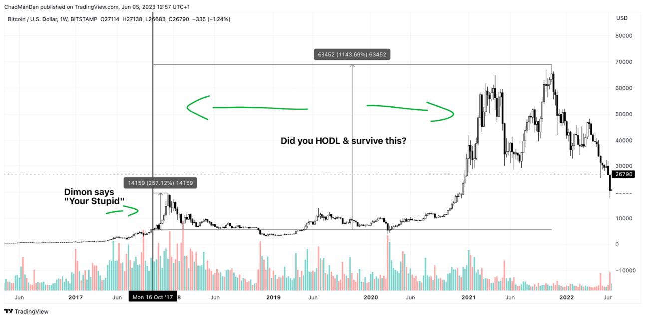 BUT, if you revenge-traded Dimon’s remark you would have made a 257% short-term increase or an 1143% gain if you survived that brutal winter to the FTX peako top.