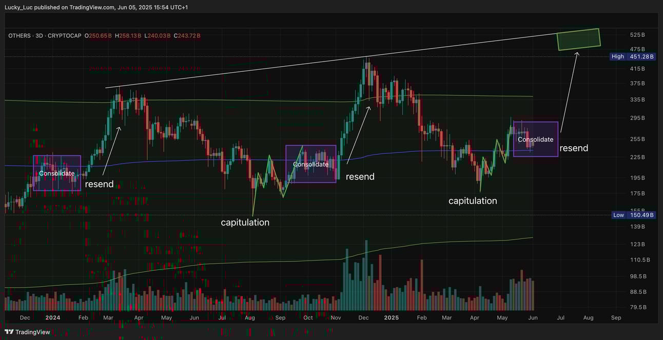 The OTHERS index is everything outside of the top 10 - your basic alt index. When we have a degenerate market like we had into December last year, it tends to top above the Value Area High (top green VWAP line).