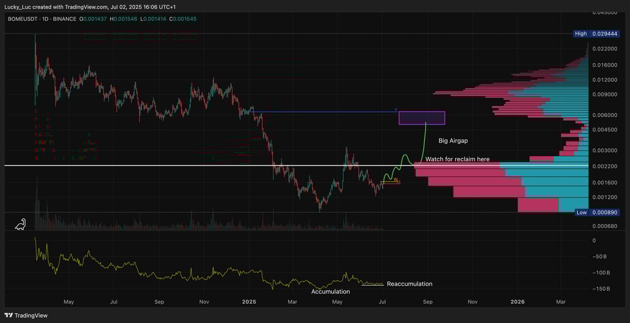 With the indicator at the bottom, we can see clear signs of accumulation and reaccumulation. Look for the price to get above that main resistance at 0.002 and reclaim. That’s an enormous run-up to the purple box. I have secured a small bag and will look to add on a Point of Control (white line) reclaim.