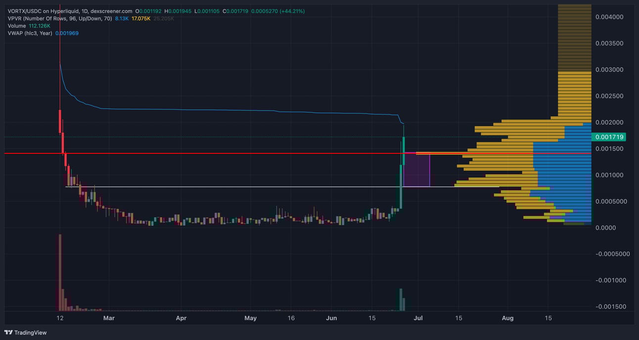 $2m Market capΒ for this soon-to-be-launched Hyperliquid prediction market seems pretty cheap. Vortx is still in development, so we have to wait to see what the team comes up with, but I will try to snag a pullback below the Point of Control (purple box) and hope to see it much higher than here in future. See Degen Corner further down this newsletter for more details.