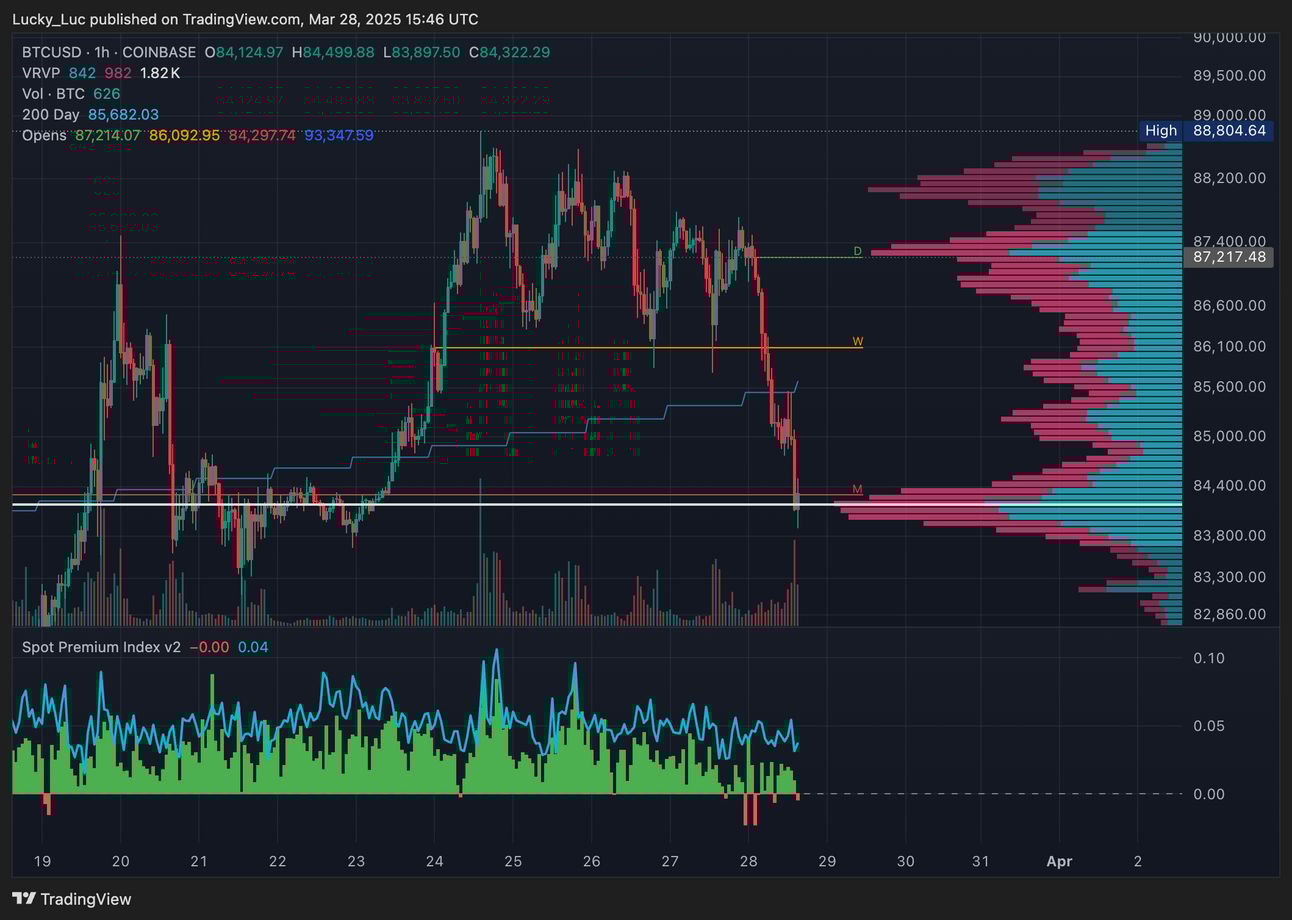 Price consolidated above the weekly open (orange W), which we fell below as the premium went negative. We then did a bearish retest from under the 200 day MA (blue line) - this is a big bull / bear pivot - and went lower. This $84k / monthly open support level we are on right now is a big one. I’m looking for the daily candle today to close above monthly open, otherwise I suspect we likely trend lower over the medium term.