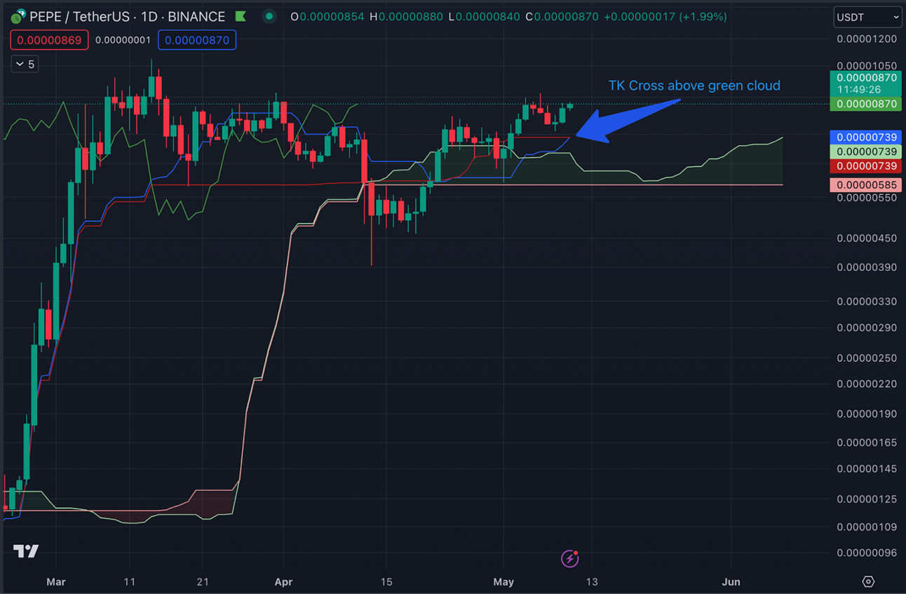 Great setup here, using crypto-specific settings on the Ichimoku Cloud. Ichimoku is an old Japanese rice trader’s trend trading strategy. When the price is above the cloud, the cloud is flipped green, and the fast-moving Tenkan (blue line) crosses above the slower Kijun (red line), that’s about the best entry signal you can get.