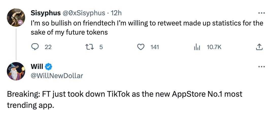 In just 22 days the Friends Tech narrative has gone from “lol, what’s this?” to “future of socialfi” to “skem” back to “future of socialfi.”
