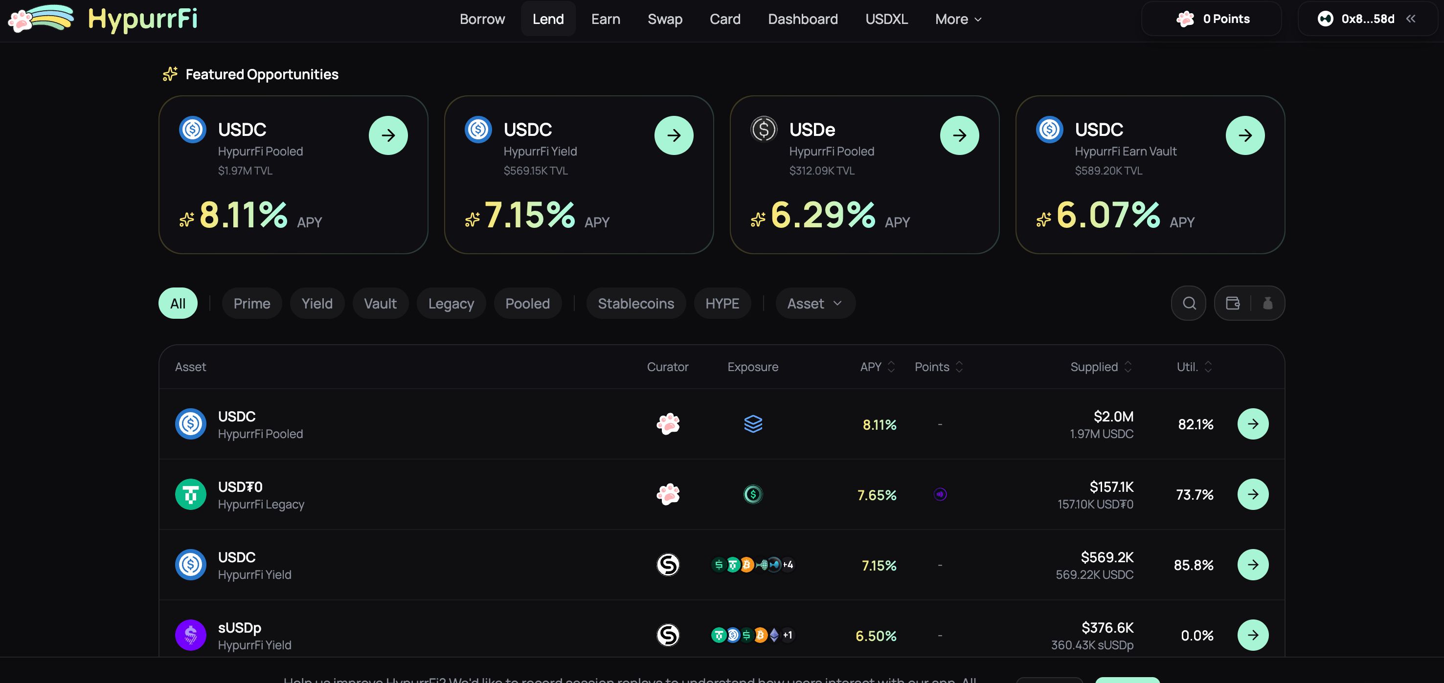 The latest upgrade definitely deserves a shout as well: HypurrFi Prime, Yield, and Pooled, created along with Euler Finance, offers a wide range of uses for your stablecoins, whether it’s USDC or others. I, for one, enjoy a quality 8.11% APY on my USDC (while praying for invisible double points)