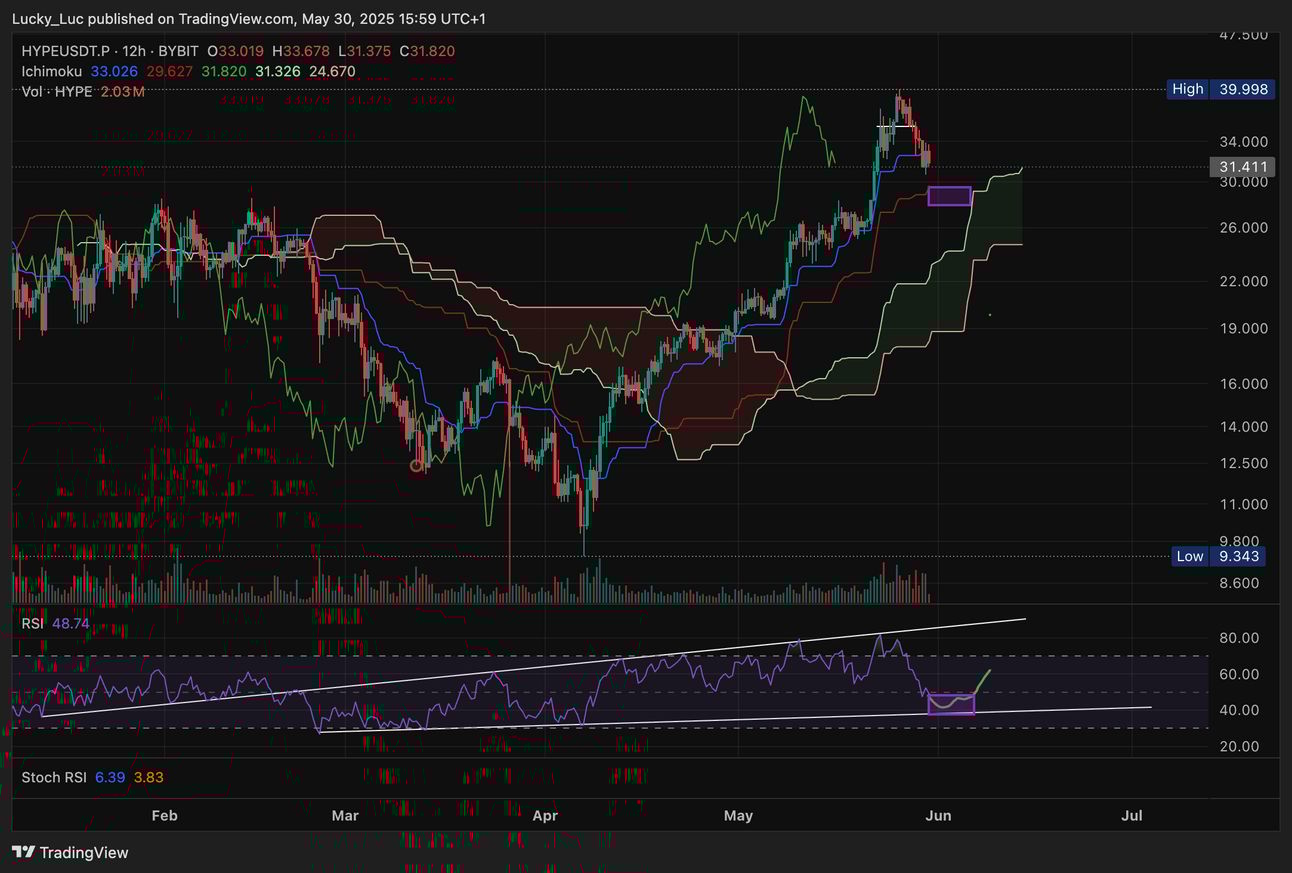 If I had to choose a date for this market pullback to bottom, I am thinking early to mid-next week. More HYPE is mostly what I want. I bought a little at $31 today and I am eyeing the 12 hour chart kijun (red line), which is the $28 area (purple box) to add to that stack. As I said yesterday, I think this is one to buy and itβs likely we get BTC price discovery soon. Check out the latest Shitcoin Church with me and Jedi for more charts and haphazard opinions on magic internet money.