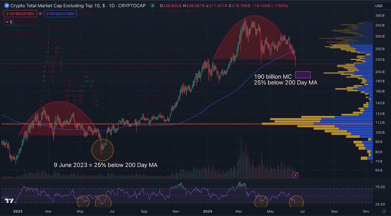 If you look at last year, we bottomed June 9 at 25% below the 200-day MA. RSI was in a similar place. The 200-day MA is typically the pivot people use to determine if a trend is bull or bear. By comparison, the $BTC 200-day MA is at $57k. Maybe it gets tested if we go for my purple box above.