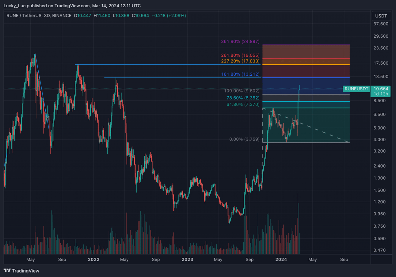 Rune recently broke out after lengthy consolidation. I was asked in Discord about targets and these can be inferred from previous highs combined with Fibonacci Extensions.