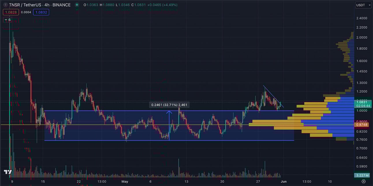 Tensor dropped the token on 8 April and has done a beautiful, high-timeframe, rangebound accumulation. After an early fakeout at the end of April, we now have another range break that looks more dependable.