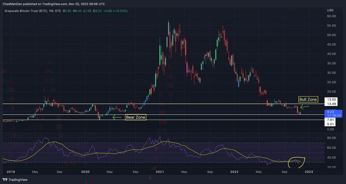 Bear case, we lose all momentum following another big dump from the FTX drainer which causes GBTC to drop down into the $7.5-$8 range.