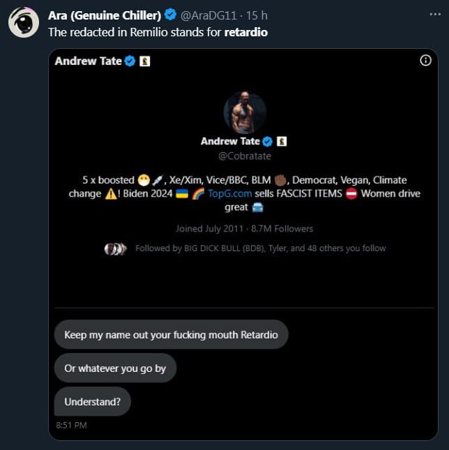 @AraDG11 has a short, but delightful conversation with Andrew Tate, just after Tate’s crypto project announcement, and a new meme is born.