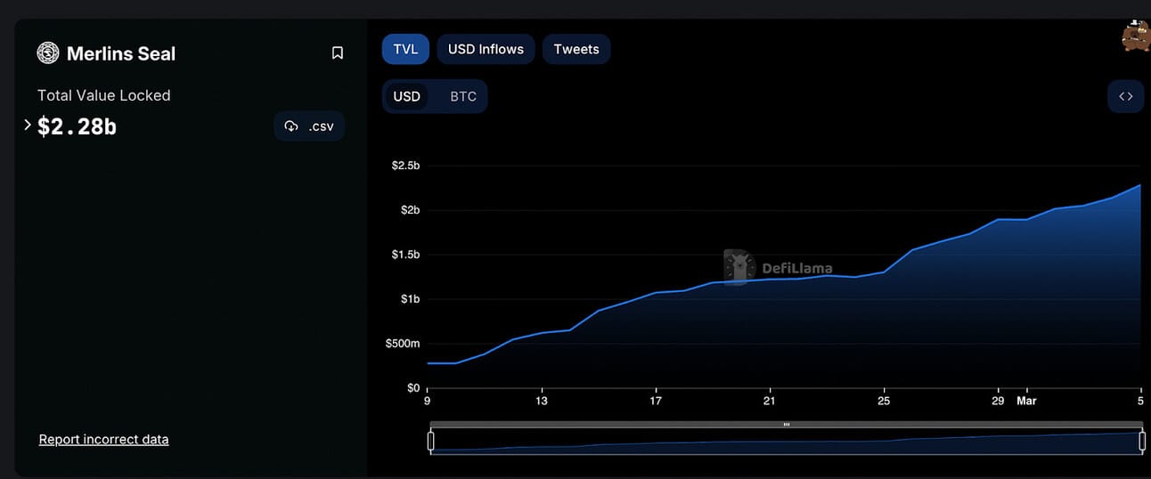 The reason is $BTC L2 Merlin Chain - they’ve added ~$2 billion of TVL since February 9.